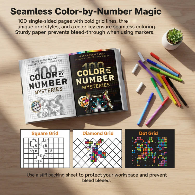 100 single-sided pages with bold grid lines, three unique grid styles, and a consistent color key ensure a seamless experience. Sturdy paper prevents bleed-through when using markers.